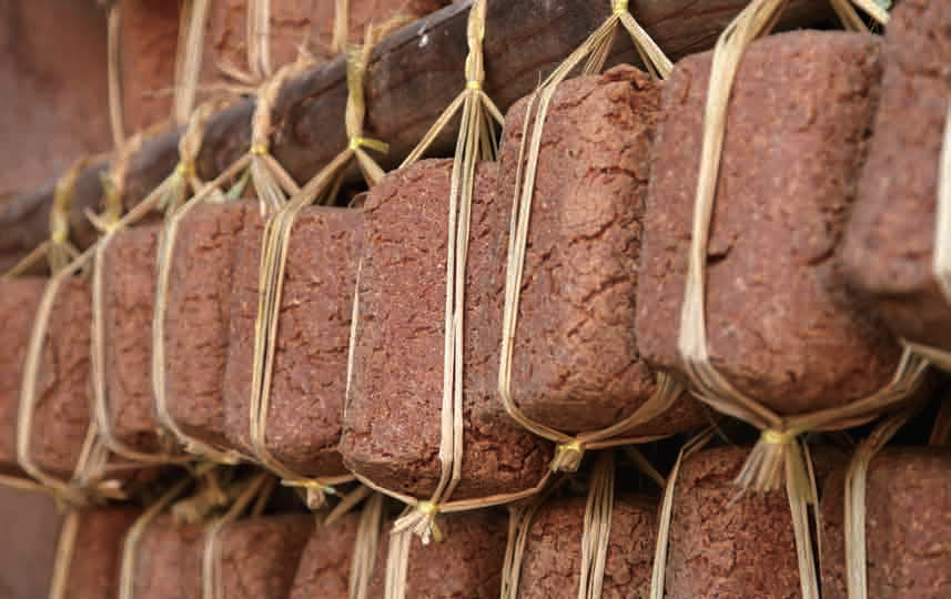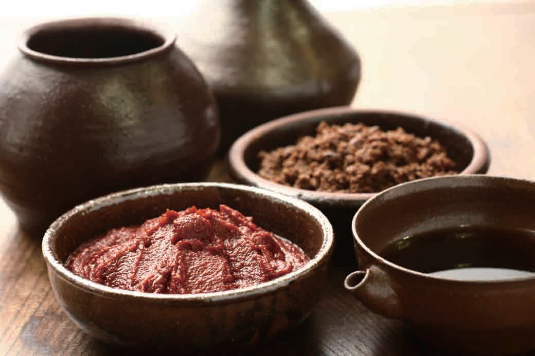 Fermented soybeans have held an important position in the diet of East Asians for thousands of years. Recipes based on fermented soybeans have been passed down within families through the generations, giving birth to a colorful range of variations. These traditional soybean-based sauces transmitted among Koreans are known as jang. The definitive examples include ganjang (soy sauce), doenjang (soybean paste), and gochujang (chili paste). Traditional Korean sauces all start with meju, which is made by pounding cooked soybeans and shaping them into blocks that are then fermented. The development of traditional Korean sauces likely began around the time when meju blocks were first produced, which is estimated as the third century CE or before.