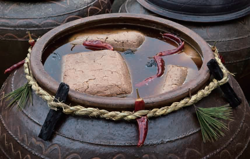 Meju blocks are placed in an onggi pot with water and salt and stored for fermentation