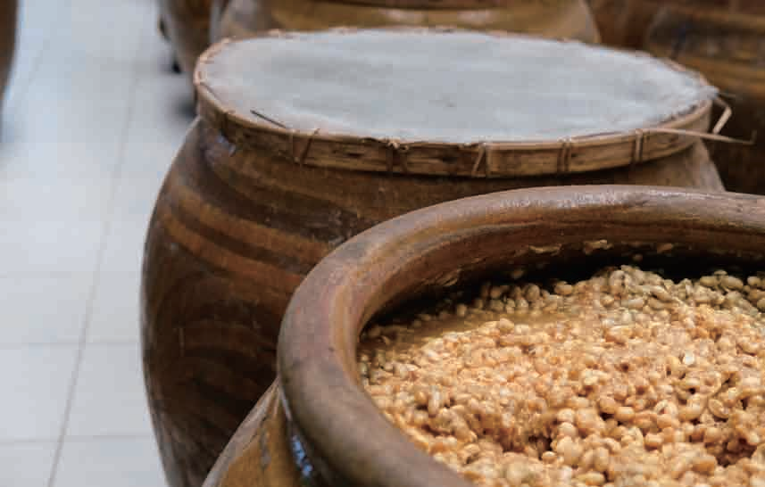 Some of the soybeans harvested in autumn are stashed away until winter and then cooked to create meju blocks. After fermentation, the meju blocks are used to produce jang. The jang sauces are brewed when it is cold so they can be gradually exposed to higher temperatures with the arrival of spring and summer. This process of fermentation progressing from low to high temperatures brings out all the different elements in the ingredients. At first they compete with each other, but with time a harmonious taste is generated. Jang sauces require attentive care during their fermentation. In the daytime, the jar containing a jang sauce should have its lid removed to allow sunrays to destroy unwanted microorganisms. The lid is put back on at night to protect the contents from moisture. The surface of a jang jar should be cleaned regularly to keep any harmful substances at bay. The final ingredient for making traditional Korean sauces is attention and time.