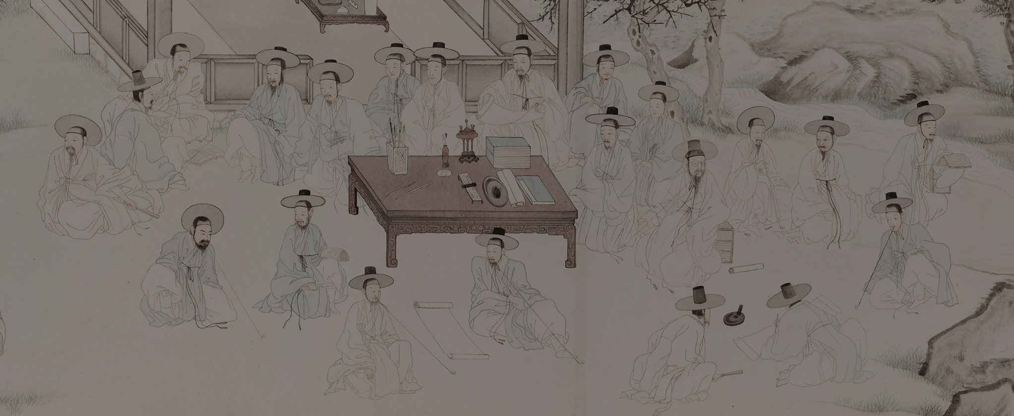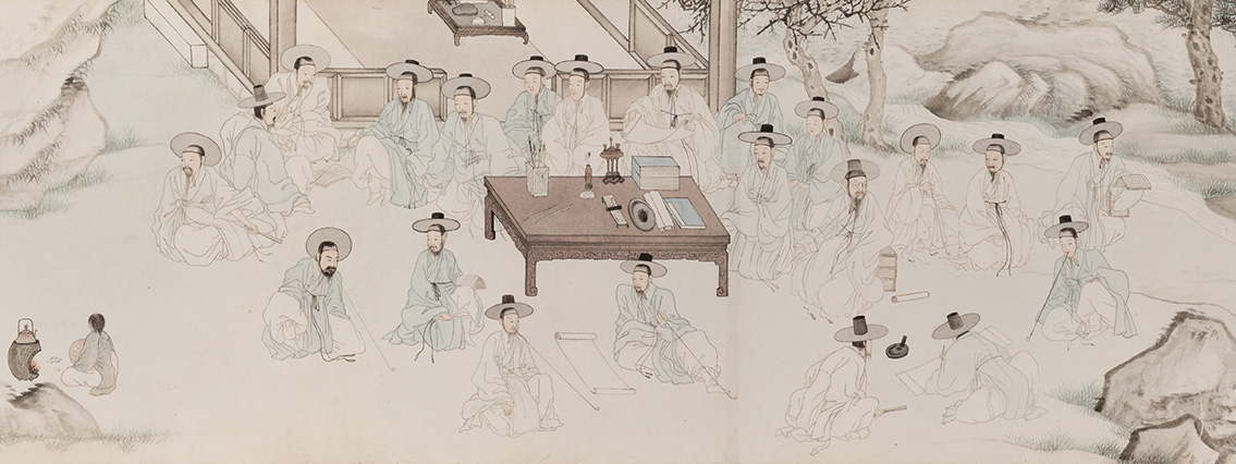 Imagining the yangban class of the Joseon Dynasty (1392–1910) calls up an image of a scholar neatly attired in a wide-brimmed black hat and long white gown while deep in the study of a book. However, this scholarly archetype is not the full story of the yangban, a term literally meaning “civil and military officials” but more generally referring to the ruling class of the Joseon Dynasty. They were no different from contemporary Koreans in seeking to forge a wide social network. Just as people today communicate through various internet-based social networking services, the Joseon-era yangban actively participated in diverse social clusters. With no duty to provide labor, the yangban could take advantage of various social opportunities to expand their political influence and appreciate cultural activities. The social groups in which they took part broadened the boundaries of their social spheres. Although accounting for only a small portion of the population, the yangban were able to efficiently regulate Joseon society. Their entitlements to land and slaves underpinned their leadership, but their strenuous efforts at social networking were an important component as well.