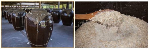 Right: The grain mash from which Makgeolli, a milky rice beer, is produced