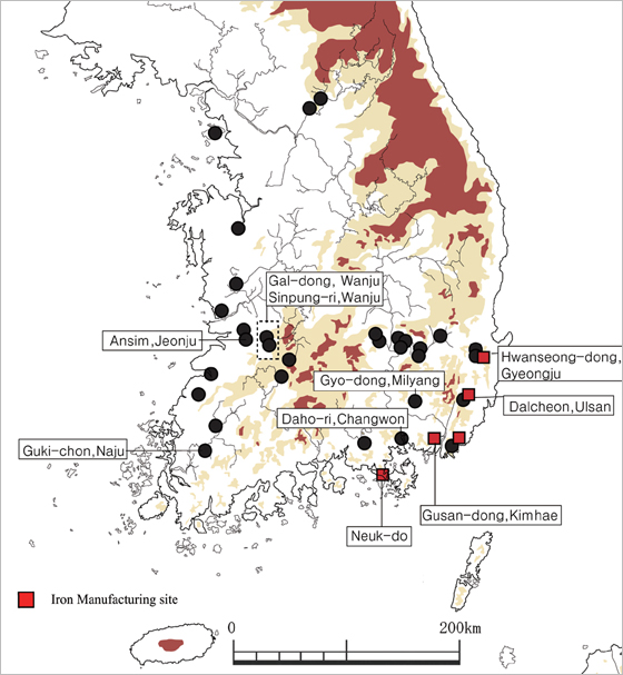 A distribution chart of iron production sites from the Three Kingdoms period (after the fourth century)