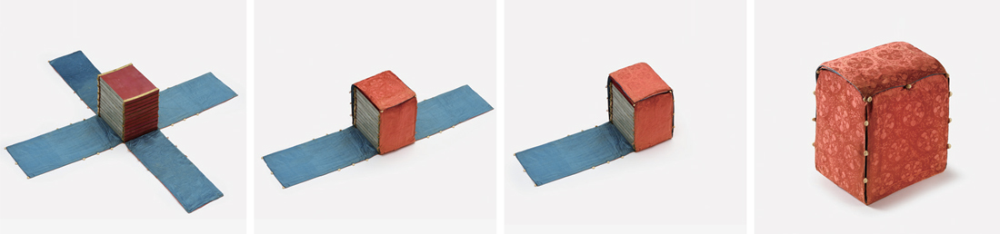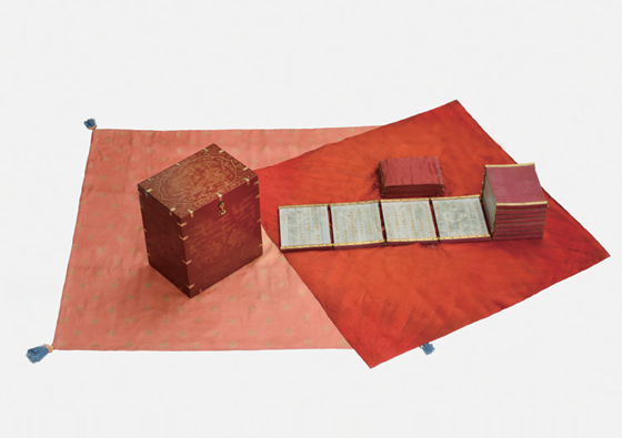 Ceremonial royal books were fashioned by binding together several inscribed plates made of jade, bamboo, or gold. To package the book, cottonfilled wrapping cloths were first placed between the plates to absorb any friction. The book was enclosed in a silk case with buttons, wrapped in a cloth, and placed in an inner box. The space between the wrapped book and the inner box was stuffed with floss, and the box was locked. The locked box was inserted in an outer box and again wrapped in a cloth to complete the packaging process. The inner box in particular was ornamented by royal painters who created diverse motifs on the surface in gold powder mixed with glue.