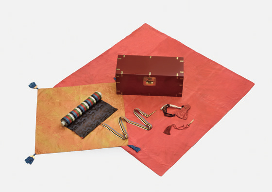 Rendered in the form of a handheld scroll, the investiture edict was first wrapped in silk cloth and fastened with lace, then placed in a red- or blacklacquered box with the space between the box and the contents stuffed with floss. Fragrant incense was added to drive off insects, and the box was secured by a lock with the key kept separately in a pouch. For the packaging of investiture edicts, red silk was the cloth of choice, and as with the inner box for a ceremonial book the packing box would be lavishly decorated with motifs including dragons, bamboo, and orchids.