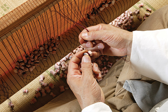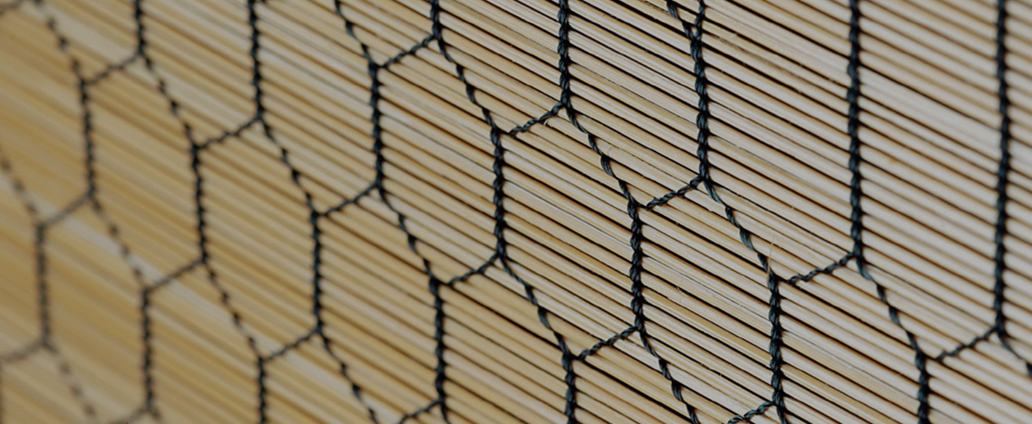 The decorative pattern Master Jo prefers is a tortoise-shell design. This hexagonal design symbolizing longevity is beautiful to the eye and also contributes to tightly binding the component bamboo strips. His bamboo blinds are both graceful and powerful.